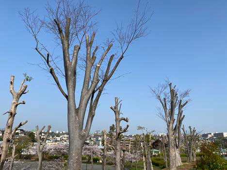 「萌芽更新」は、高木化した公園樹木を髙さ4m 程度で幹を切り揃え、幹の切り口から若い芽(萌芽)を育て、世代交代・活性化させることです。港南台北公園は40年前に公園を公開した当初は、自然放置していましたが、生育につれ、高木化してしまいました。令和元年の台風19号で、高木化した樹木が近隣住宅に被害をもたらしたという教訓を生かし、防災上の理由で伐採することとなり、萌芽更新の手法を採用したのです。「萌芽更新」によって、地表に太陽光が届くようになり周囲に落下していた種子により天然更新も進みます。日光が林の中に入ることで、日影により休眠していた草花や従来そこに生育していた昆虫や小動物が帰ってきます。「萌芽更新」により樹林が若返ることで、倒木等のリスクが減少するのです。